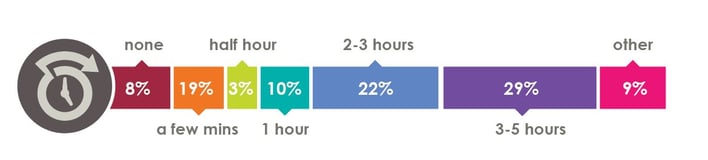 There have been a few changes from 2018 when it comes to overtime in ecommerce management. Last year, 12% told us they did a few minutes here and there which has increased to 19% this year. 22% complete 2-3 hours of overtime this year, down from 26% in 2018.
